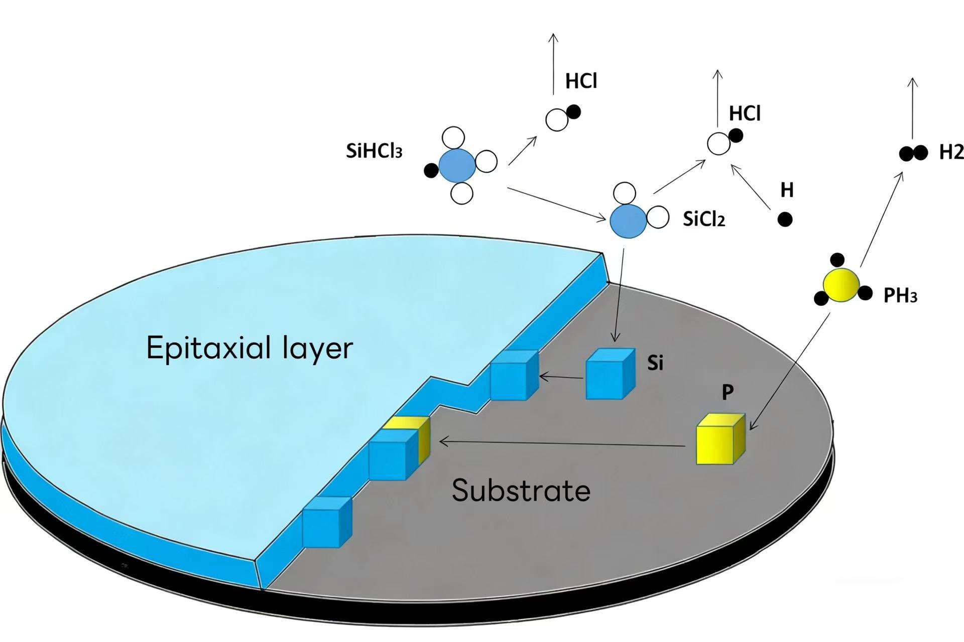 A epitaxia de silício geralmente usa um forno de epitaxia em fase de vapor. Seu princípio é que a decomposição da fonte de silício (como silano, diclorossilano, triclorossilano e tetracloreto de silício reage com o hidrogênio para gerar silício. Durante o crescimento, gases dopantes como PH₃ e B₂H₆ podem ser introduzidos simultaneamente. A concentração de dopagem é controlada com precisão pela pressão parcial do gás para formar uma camada epitaxial com uma resistividade específica.