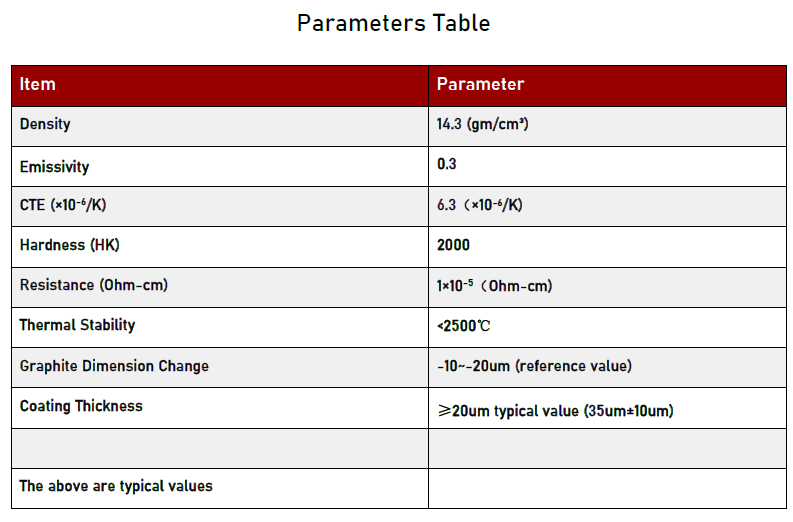 O carboneto de tântalo é um material de alto desempenho com ponto de fusão extremamente alto (aproximadamente 3880 ℃), excelente condutividade térmica, estabilidade química superior e excelente resistência mecânica. Os parâmetros de desempenho específicos são os seguintes: